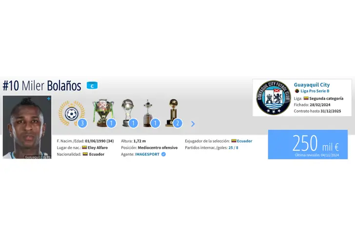 Según portales especializados como Transfermarkt, el valor de mercado actual de Miller Bolaños se estima en alrededor de 250 mil dólares. Este valor refleja la trayectoria del jugador, su experiencia y su rendimiento reciente en la Serie B de Ecuador. Es importante destacar que el precio final de un traspaso puede variar dependiendo de las negociaciones entre los clubes involucrados.