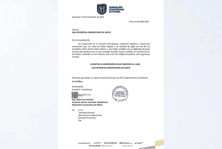 La FEF decidió sancionar a Liga de Quito debido al incumplimiento de pagos a dos exjugadores del club: Franklin Guerra y Renato Ibarra. Según la Federación, el equipo albo no habría cumplido con las obligaciones económicas estipuladas en los contratos de los futbolistas.