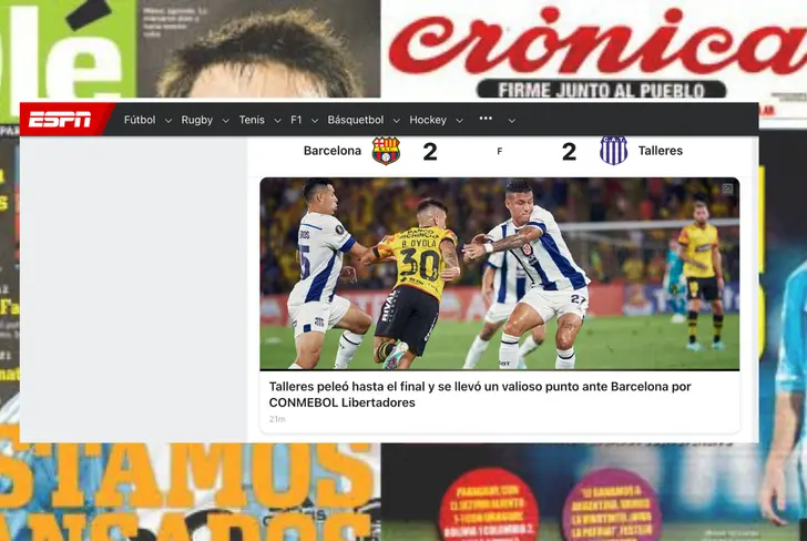 Barcelona Sporting Club fue sorprendido por Talleres en la Copa Libertadores, que de forma agónica a los 96 minutos consiguió un empate dejando desilusión en toda la hinchada amarilla. Tras lo sucedido la prensa argentina reaccionó, resaltando a La T por lo conseguido.