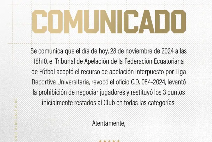 Liga de Quito recibió la respuesta de la FEF sobre la resta de puntos. Por medio de un comunicado oficial por el cuadro albo, el equipo albo oficializó que se le devolvieron los 3 puntos y con esto llega a la última fecha con grandes posibilidades para ganar la 2da etapa.