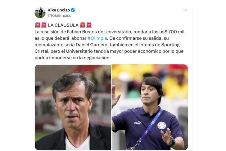 El periodista paraguayo Kike Enciso indicó que Olimpia pagará 700 mil dólares por Fabián Bustos, que es la cláusula de rescisión que le puso Universitario. Luego del éxito que tuvo en Perú en el 2024 se volvió un entrenador muy atractivo y por eso uno de los clubes grandes de Sudamérica decidió desembolsar una fortuna para contratarlo.