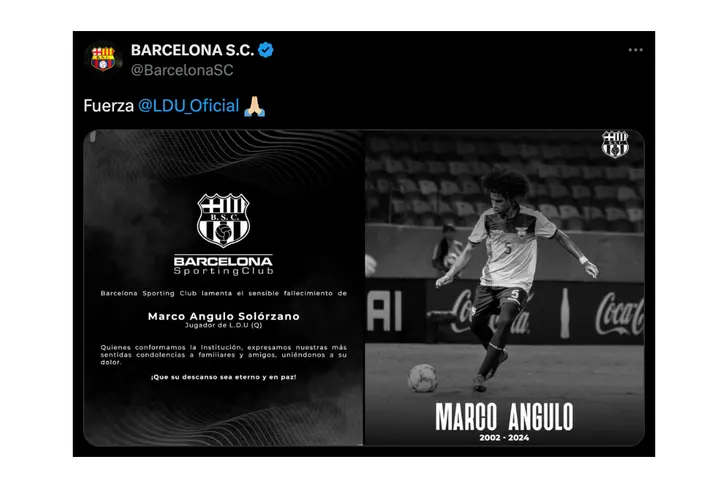 Barcelona SC mandó un mensaje a Liga de Quito y deseó "fuerza", por la sensible pérdida de Marco Angulo a la edad de 22 años. Se recuerda que en octubre sufrió un accidente de tránsito en la Autopista General Rumiñahui, en la cual dos de sus acompañantes fallecieron al instante. El mundo del fútbol lamenta esta noticia y han llegado mensajes de todo el mundo.