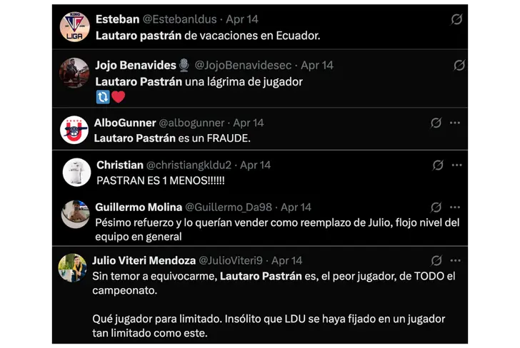 Los hinchas de Liga de Quito han manifestado su descontento en redes sociales con el rendimiento de uno de los refuerzos traídos para la temporada 2025: el argentino Lautaro Pastrán. Si bien el jugador llegó con expectativas de aportar velocidad y desequilibrio por las bandas, muchos aficionados consideran que su desempeño hasta el momento no ha estado a la altura de lo esperado. Comentarios en plataformas como X y Facebook expresan frustración por su falta de contundencia en el ataque, sus imprecisiones en los pases y su inconsistencia en los duelos individuales.