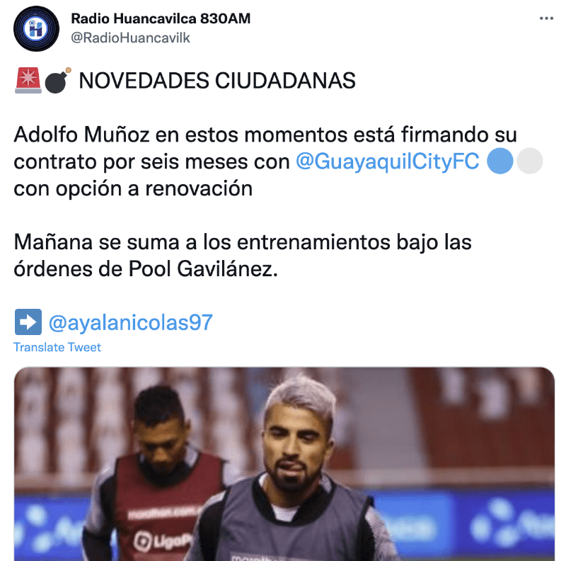 De acuerdo a información de Nicolás Ayala, Adolfo Muñoz ya firmó su contrato por seis meses con Guayaquil City y desde mañana tendrá la oportunidad de unirse a los entrenamientos de cara al segundo semestre.