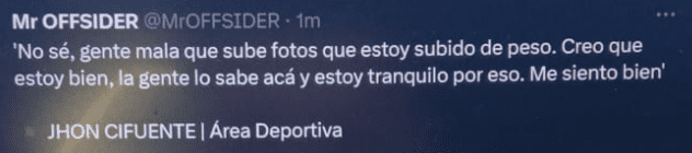 Por otro lado, llamo ‘malas gentes’ a quienes lo han criticado por su peso, aclarando se siente bien pese a las fotos que han subido en las redes sociales. Jhon Jairo Cifuentes logró anotarle a Emelec en el Gonzalo Pozo Ripalda y colaboró con la victoria. El delantero ecuatoriano, sigue trabajando y demostrando en la cancha.