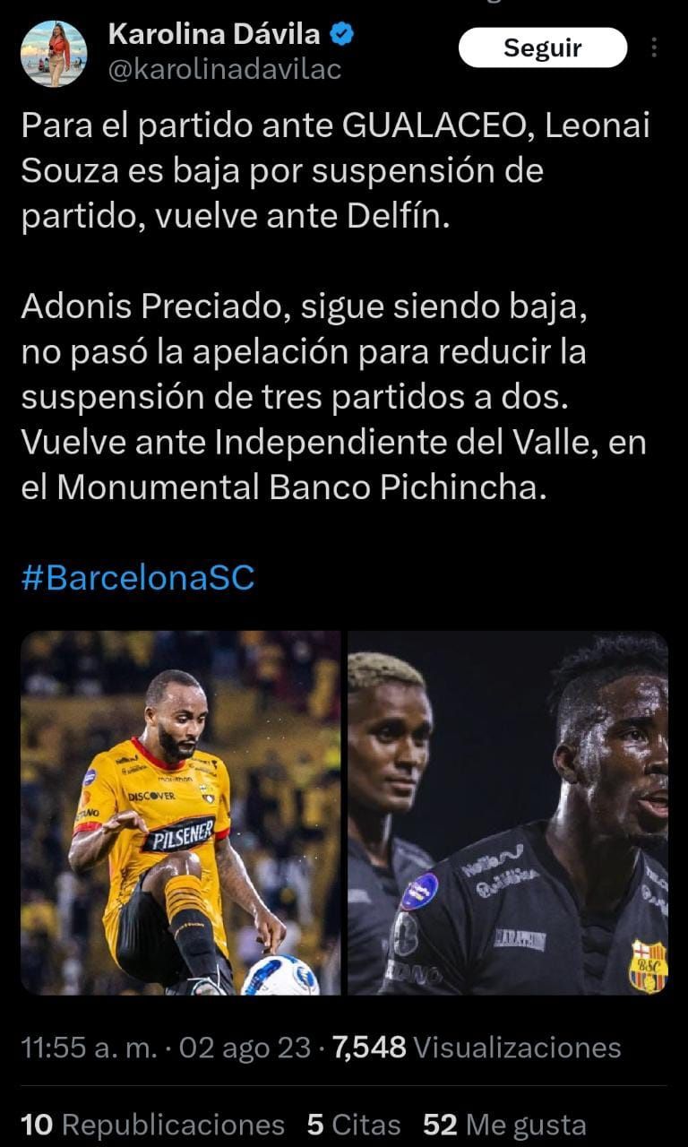 Faltando pocos días para el partido entre Barcelona SC y Gualaceo SC, se ha confirmado que el club tendría bajas. Pues los toreros no podrán iniciar con todos los elementos de su plantilla, debido algunos presentan lesiones y otros presentan sanciones. La periodista Karolina Dávila en su cuenta de Twitter ha informado que “Leonai Souza es baja por suspensión de partido”, así mismo, “Adonis Preciado, sigue siendo baja, no pasó la apelación para reducir la suspensión de tres partidos”.