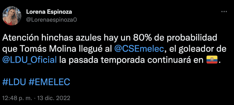 Emelec, con la directiva encabezada por José Pileggi, quiere a Tomás Molina en sus filas. Según la colega Lorena Espinoza, hay un 80% de posibilidades de que Tomás Molina llegue a Emelec. Al parecer el delantero es del total agrado de Emelec, y lo quieren para la próxima temporada.