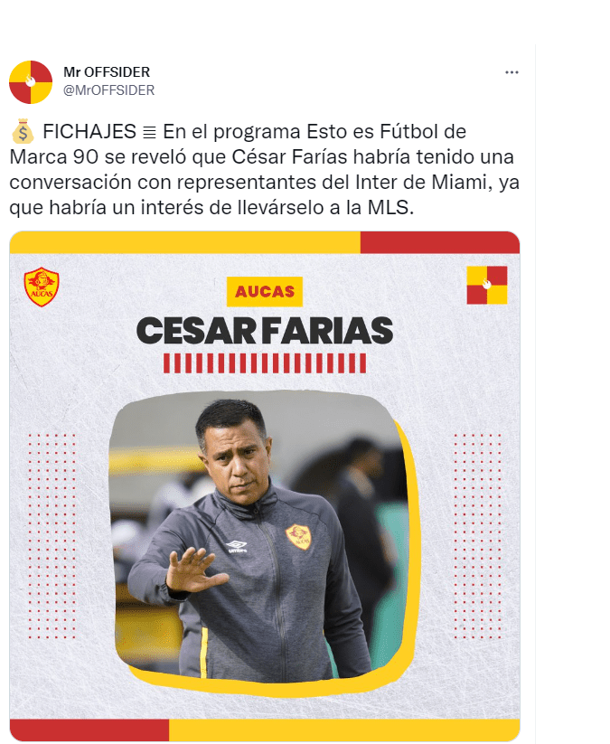 Ahora ha trascendido que el técnico César Farías, habría tenido una converación con representantes del Inter Miami (equipo de Leonardo Campana), con intenciones de llevarlo a la MLS. Sin daudas, sería un golpe muy fuerte para Aucas, ya que se llevarían al estratega que logró el máximo objetivo del equipo en 77 años de historia.