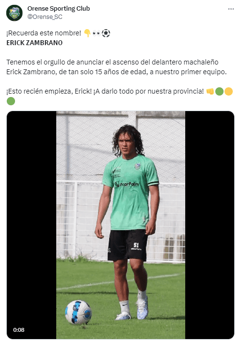 Orense anunció en sus redes sociales que ascendió al equipo de primera a Erick Zambrano. Le dicen Cavani, viene de anotar 24 goles en 18 partidos con la Sub 15 y en la Sub 19 anotó 6 goles en 6 partidos, por lo que podría nacer un nuevo delantero para la selección.
