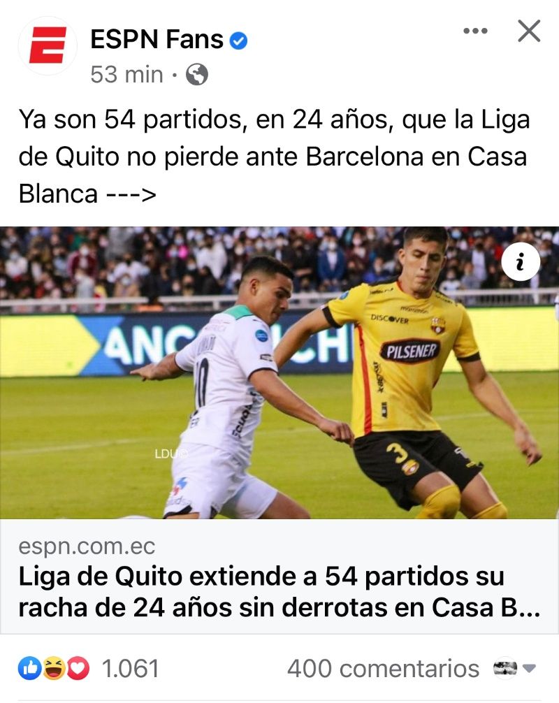 Además la cadena internacional recalcó que ya son 54 compromisos que Barcelona SC no tiene alguna victoria sobre Liga de Quito. Los hinchas no dejaron pasar la oportunidad para sacar pecho de la marca que tiene LDU.