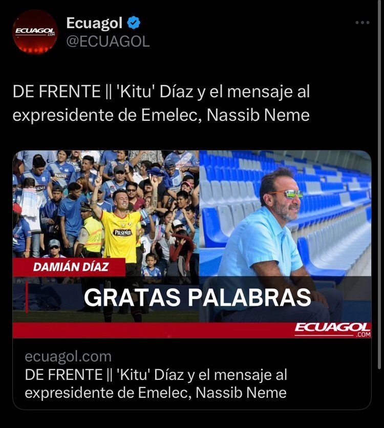Damián Díaz habló de Neme y su paso por Emelec y esto fue lo que dijo: “He tenido siempre una cordialidad con Nassib así que muchísimo respeto, la verdad es un alivio que ya no esté, fue uno de los mejores dirigentes del fútbol ecuatoriano, sin duda desde que estoy yo” Esto llega en medio del mal momento futbolístico del cuadro azul.