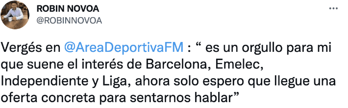 “Es un orgullo para mi que suene el interés de Barcelona SC, Emelec, Independiente y Liga de Quito, ahora solo espero que llegue una oferta concreta para sentarnos hablar”, explicó el extremo izquierdo que le caería como anillo al dedo a BSC si sale Emmanuel Martínez.