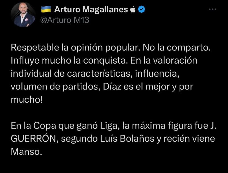 En su cuenta de Twitter, Arturo Magallanes escogió a Damián Díaz es el mejor 10 del fútbol ecuatoriano por todos los años que lleva rindiendo en el fútbol ecuatoriano, ya que Damián Manso no fue figura en la Copa Libertadores que ganó Liga de Quito.