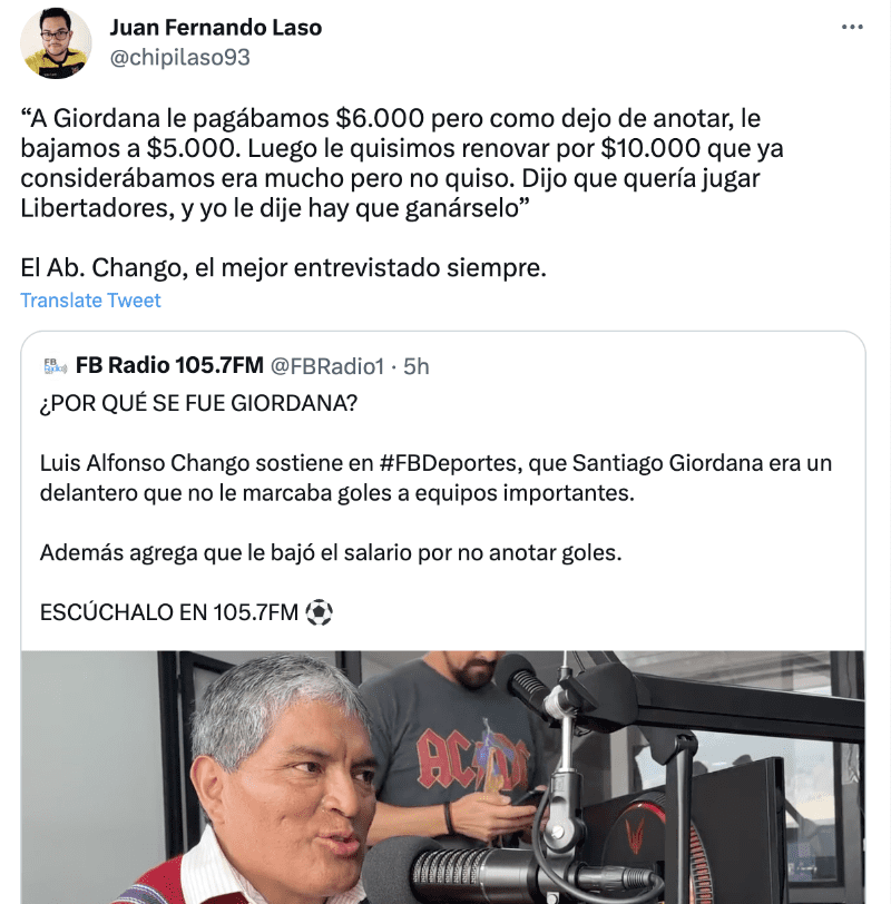Se trata de Santiago Giordana quien, de acuerdo a lo que contó Luis Alfonso Chango en entrevista con FB Radio, cobró 6 mil y cuando bajó el rendimiento le bajaron a 5 mil mensuales. Luego le quisieron renovar por 10 mil pero no aceptó porque quería jugar la Libertadores. Finalmente LDU se durmió y no lo llevó.