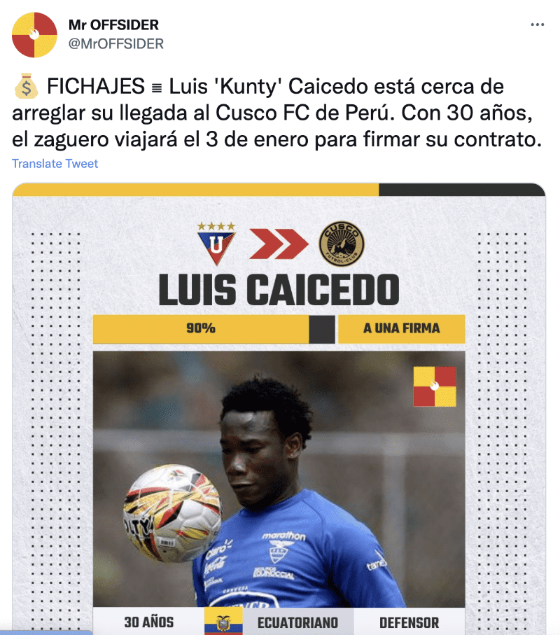 Pues ahora, luego de su amarga salida de Liga de Quito, Luis Caicedo ha conseguido nuevo equipo pero no en Ecuador sino Perú ya que, de acuerdo a información de la cuenta Mr OFFSIDEN, Cusco FC lo espera. Este equipo estuvo en el 2022 en Segunda de Perú pero ascendió y quieren que el Kunty sea su seguro en la zaga central.
