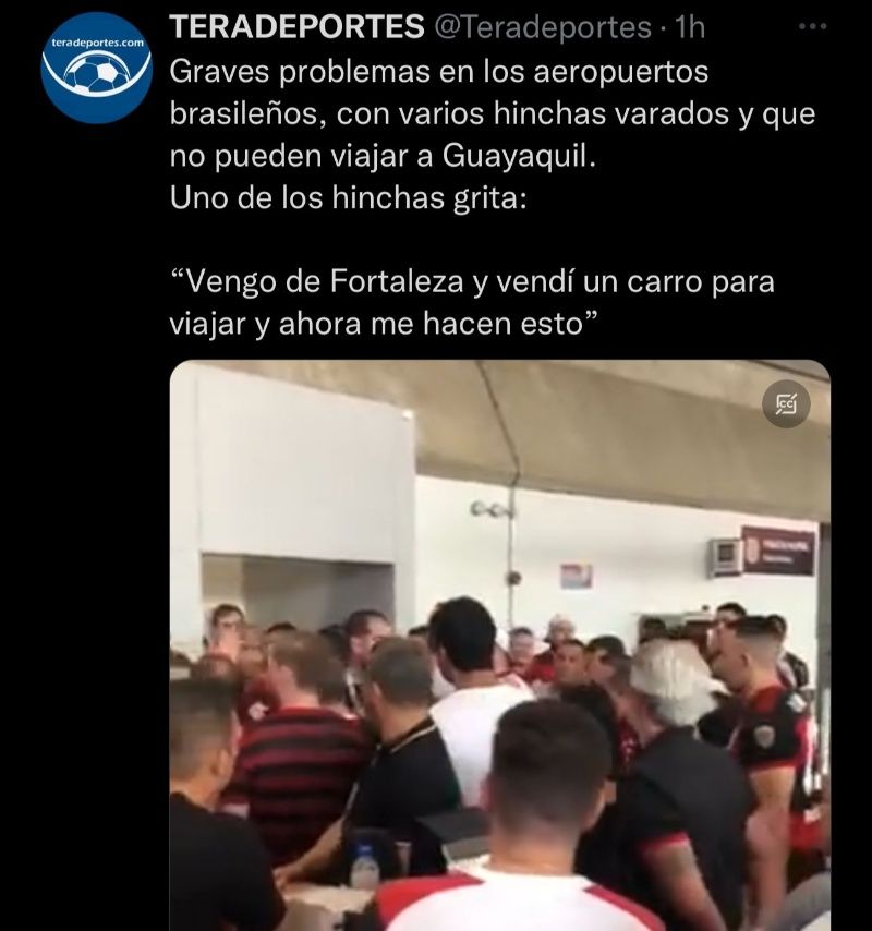 Sin embargo, en el aeropuerto de Brasil, existe problemas y no dejan viajar a miles de hinchas de Flamengo hacia Guayaquil. Un aficionado incluso manifestó: “Vengo de Fortaleza y vendí un carro para viajar y ahora me hacen esto”, el fanatismo de los hinchas llega a cuestiones inimaginables con tal de ver a su equipo.
