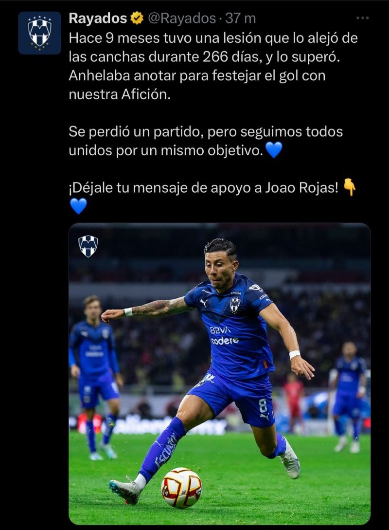Desde Monterrey decidieron apoyar a Joao Rojas: “Hace 9 meses tuvo una lesión que lo alejó de las canchas durante 266 días, y lo superó. Anhelaba anotar para festejar el gol con nuestra Afición. Se perdió un partido, pero seguimos todos unidos por un mismo objetivo. ¡Déjale tu mensaje de apoyo a Joao Rojas!”