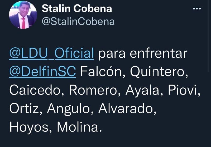 De acuerdo a información de Stalin Cobeña, el once que pondrá ante Delfín SC es con: Gonzalo Falcón; José Quintero, Luis Caicedo, Zaid Romero, Luis Ayala; Ezequiel Piovi, Joao Ortiz, Nilson Angulo, Alexander Alvarado, Michael Hoyos; Tomás Molina.