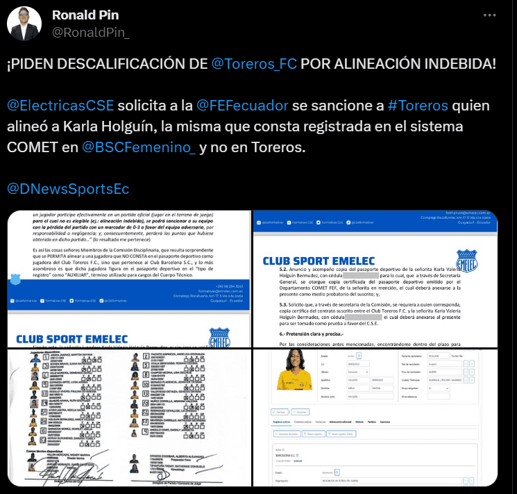 De igual forma en el fútbol femenino les pasó de la misma forma y en un partido complicado terminaron eliminadas por Toreras Fútbol Club. Parecía que todo estaría normal, pero decidieron reclamar y pedir la descalificación del equipo por una alineación indebida. Así lo confirmó el periodista Ronaldo Pin, esto debido a que según explicaron la jugadora Karla Holguín está registrada en Barcelona SC femenino y no en Toreras.