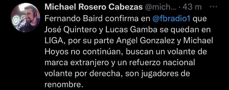 Michael Hoyos, aún está en el limbo, porque quería continuar en Liga de Quito, pero no lo ratificaron: “No he tenido ningún contacto con la dirigencia, eso lo maneja mi representante. Esperaré con tranquilidad y nada más. Tuve un año muy bueno, estuve contento. Yo ya dejé saber mi postura y lo que quiero, pero mi pase le pertenece a Barcelona y no depende de mí. Estoy con la familia y he puesto todo en manos de mi representante”, señaló Hoyos para Área Deportiva.
