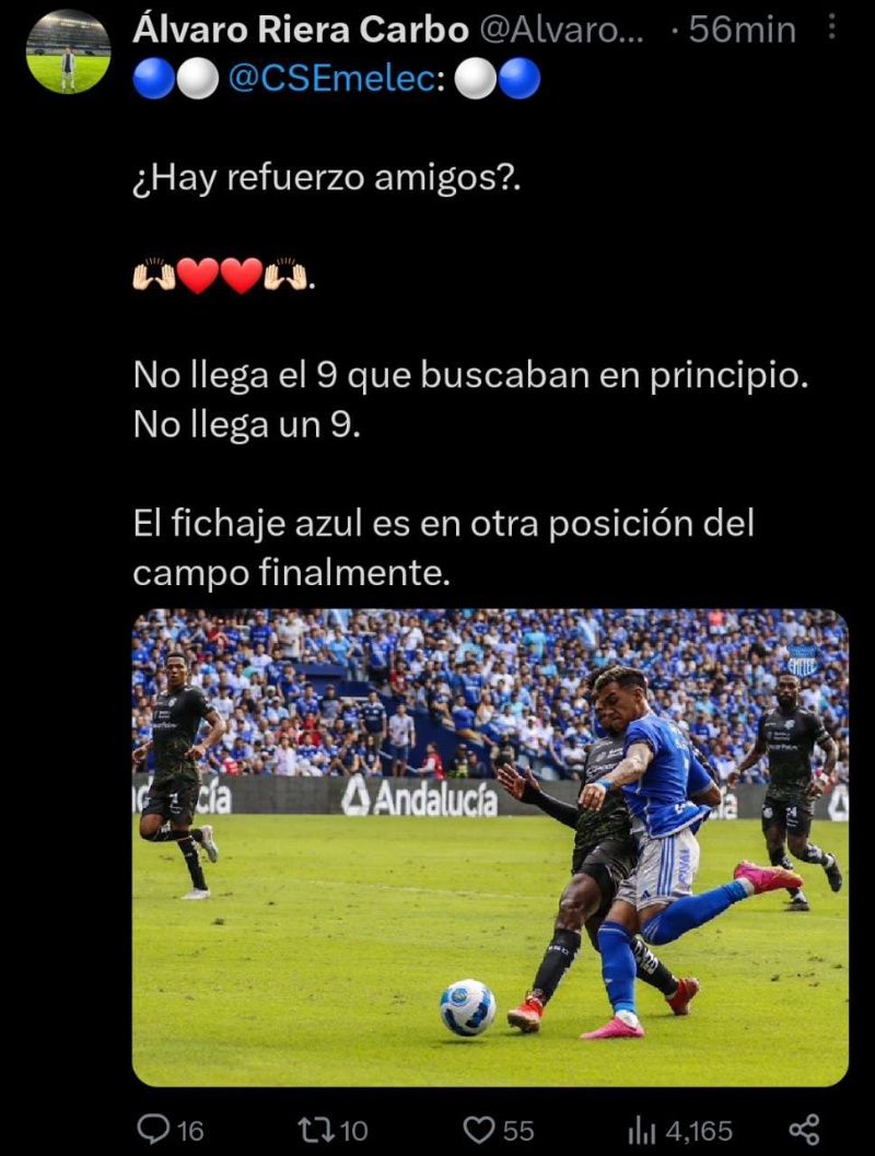 Por lo que la directiva del equipo del Club Sport Emelec buscaría reforzar la plantilla con nuevos jugadores. Debido a esto, uno de los periodistas de la ciudad de Guayaquil confirma quien sería el jugador que podría ser uno de los elementos que se sumen a las filas dirigidas por Hernán Torres. Ya que en su cuenta de Twitter, Álvaro Riera Carbo, menciona que “No es el 9 que buscaban en principio, no llega un 9. El fichaje azul es en otra posición del campo finalmente”. Minutos más tarde publica el nombre del jugador, al escribir “El nombre que me dan es Aníbal Chalá”.