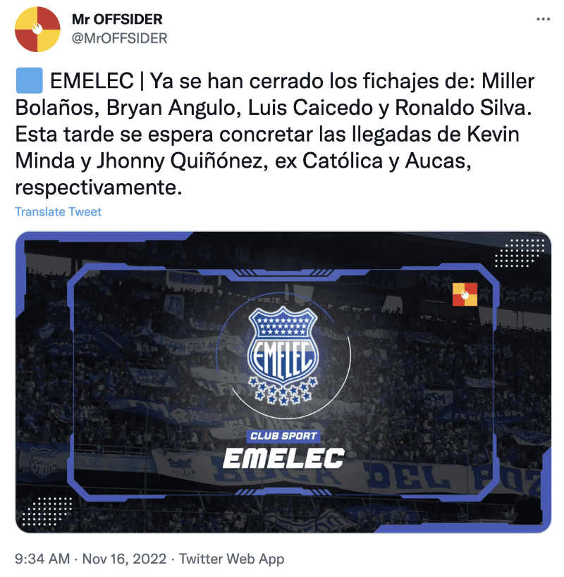 De acuerdo con información del portal en Twitter Mr OFFSIDER, Emelec espera cerrar en las próximas horas de Jhonny Quiñónez, quien fue campeón ecuatoriano con Sociedad Deportivas Aucas, luego de ganar la final contra Barcelona SC. El jugador tuvo una lesión que lo alejó por varios meses de las canchas pero volvió con un gran nivel.
