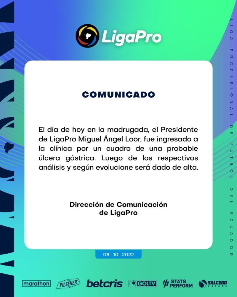 En las últimas horas, se conoció que el presidente de la Liga Pro, Miguel Ángel Loor fue internado porque presentó una úlcera gástrica: “El día de hoy en la madrugada, el Presidente de LigaPro Miguel Ángel Loor, fue ingresado a la clínica por un cuadro de una probable úlcera gástrica. Luego de los respectivos análisis y según evolucione será dado de alta.”