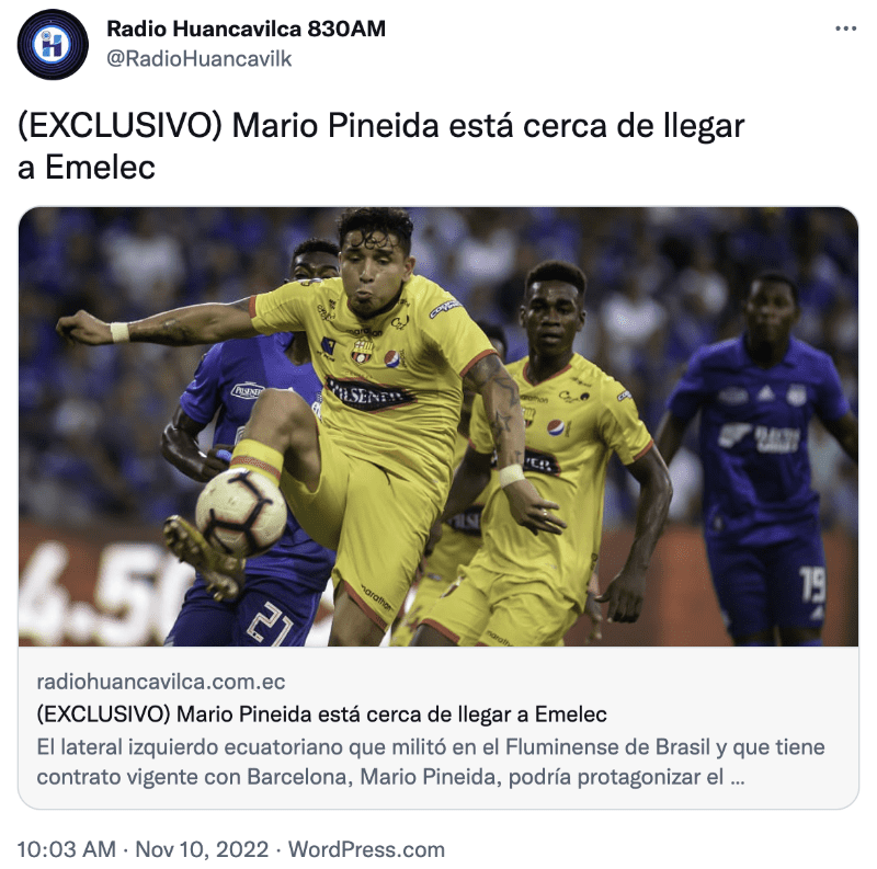 El jugador ecuatoriano de los registros de Barcelona SC ahora tiene una propuesta de Emelec y de acuerdo a información de Transfermarkt, se deben desembolsar cerca de 800 mil dólares para hacerse de sus derechos deportivos. Se verá si finalmente Mario Pineida da el cambio y se va al rival acérrimo de BSC.