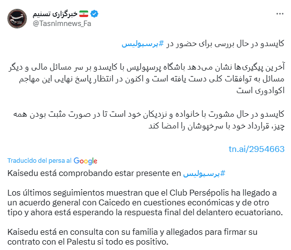El medio iraní Tasnim News afirmó que hay un acuerdo entre Persépolis FC y Felipe Caicedo para su fichaje. El tema económico ya estaría definido, lo cual indicaría que el ecuatoriano aceptó la oferta y solo falta que su familia apruebe este movimiento hacia Irán.