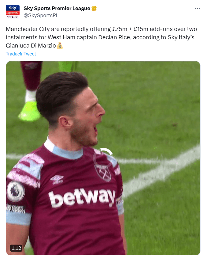 Según Sky Sports, Manchester City le acercó una oferta de 75 millones de libras esterlinas por Declan Rice y el jugador estaría más interesado en fichar por los últimos campeones de la Champions League.