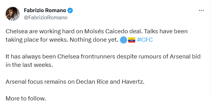 Fabrizio Romano lo confirma, el golpe bajo que le dio Arsenal a Moisés Caicedo
