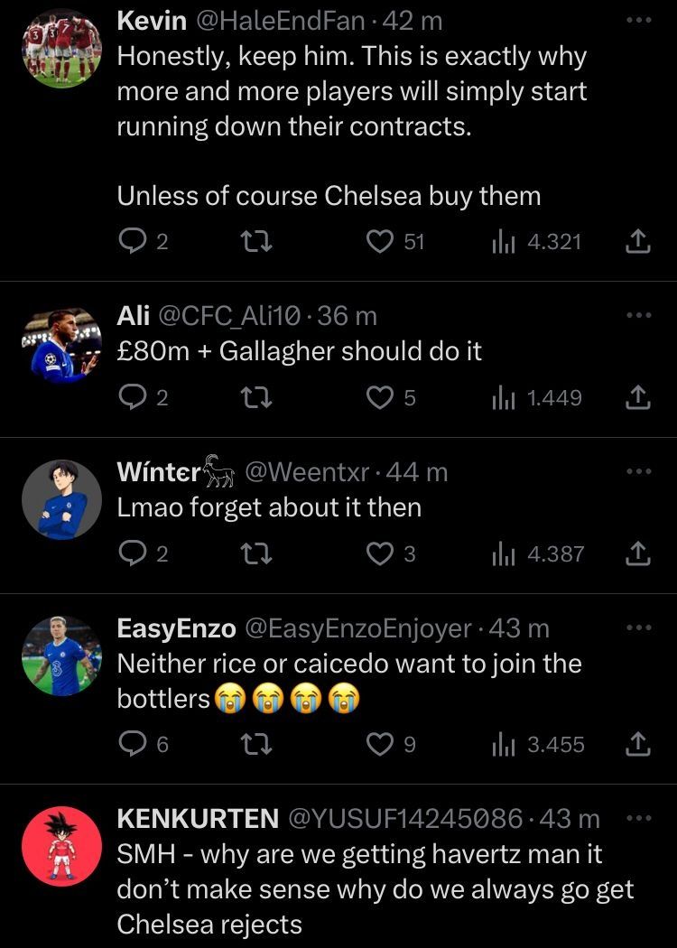 De acuerdo al periodista Eduardo Hagn : “Tony Bloom valora a Moisés Caicedo en 120 millones de libras esterlinas. El Chelsea está en la pole position.” Este comentario en twitter generó la respuesta de varios hinchas de Arsenal no gustó y piensan que quizá estaría siendo muy excesivo el dinero que están pidiendo.