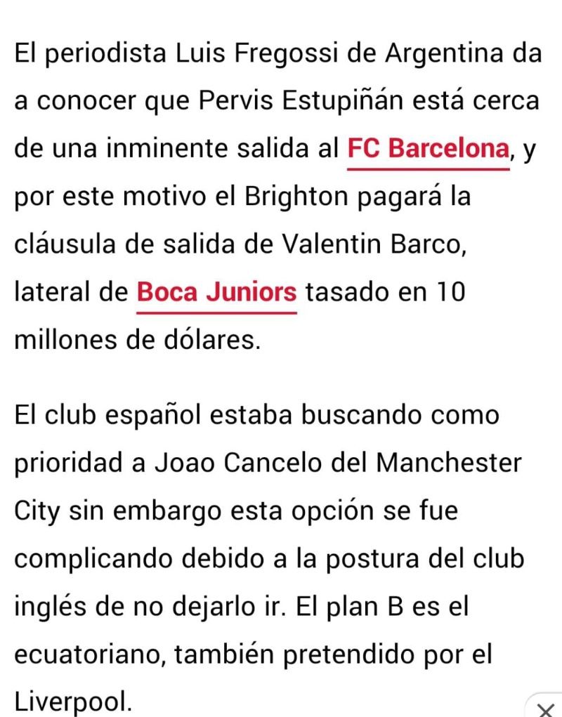 Tras sus grandes actuaciones, el jugador ecuatoriano ha logrado captar la atención de grandes equipos del viejo continente. Uno de ellos el Liverpool, pero al parecer no sería el único equipo grande de Europa interesado en Pervis. Ya que el periodista argentino, Luis Fergossi, ha dicho que “Pervis Estupiñán está cerca de una inminente salida al FC Barcelona. El club español estaba buscando como prioridad a Joao Cancelo del Manchester City, sin embargo esta opción se fue complicando. El plan B es el ecuatoriano, también pretendido por el Liverpool.”.