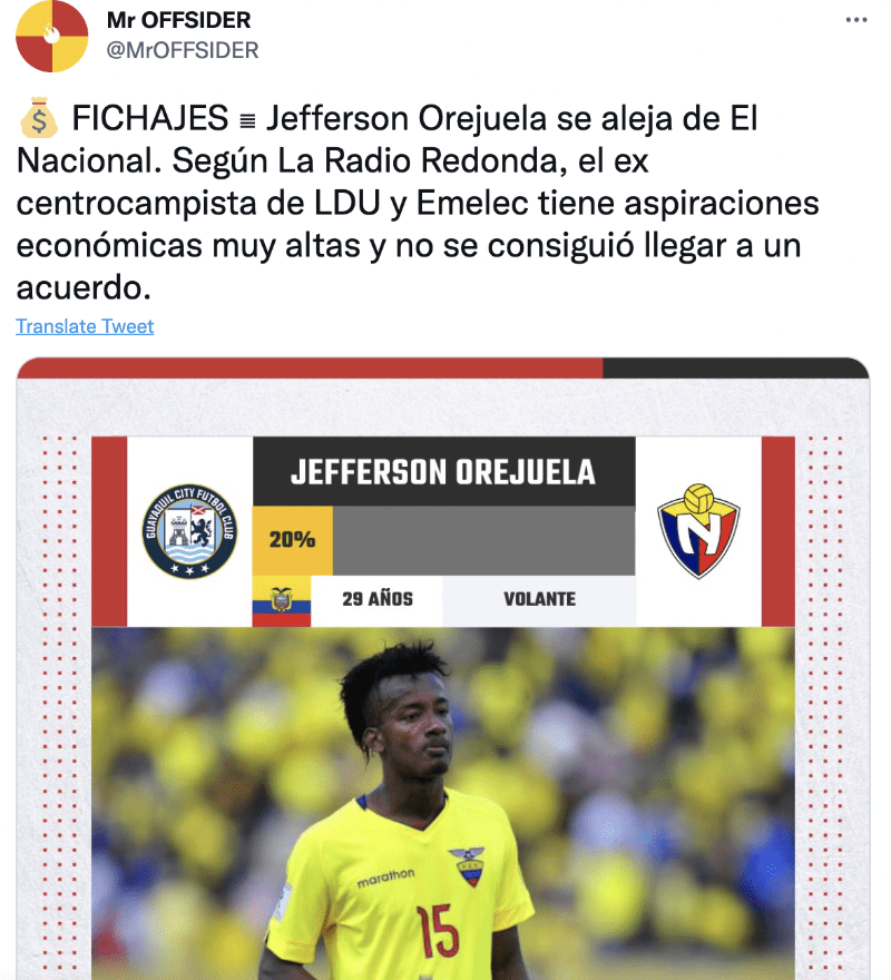 Jefferson Orejuela descartó la posibilidad de jugar en El Nacional debido a que no le quisieron pagar lo que pedía, por lo que de momento sigue sin tener un equipo para el 2023. Cabe recordar que Jefferson Orejuela ya estuvo en los tres grandes equipos del país como son Liga de Quito, Barcelona SC y Emelec.