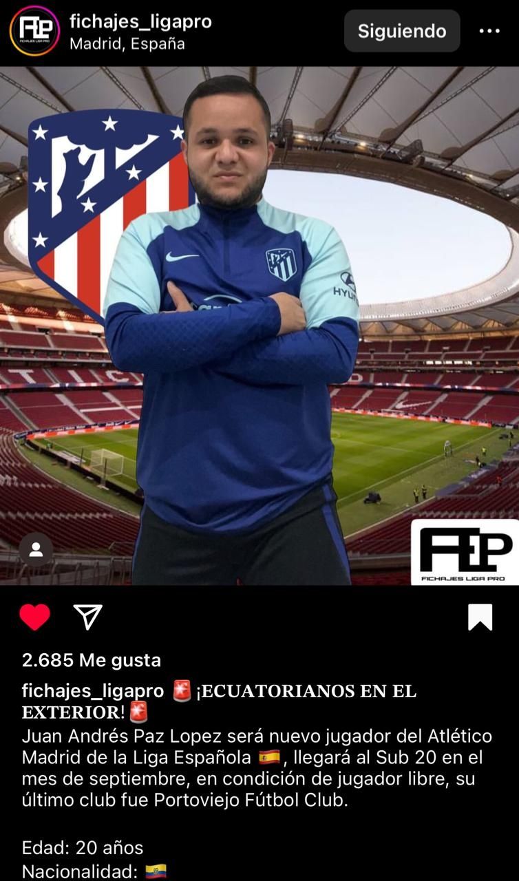 Según la página especializada en traspasos Fichajes LigaPro, Juan Andrés Paz López, mediocentro de 20 años jugará en la Sub 20 de Atlético de Madrid. Llegará en septiembre en condición de jugar libre, procedente de Portoviejo Fútbol Club.