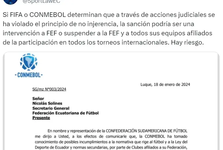 "Si FIFA o CONMEBOL determinan que a través de acciones judiciales se ha violado el principio de no injerencia, la sanción podría ser una intervención a FEF o suspender a la FEF y a todos sus equipos afiliados de la participación en todos los torneos internacionales. Hay riesgo", reveló Vásconez en su cuenta de 'X'.