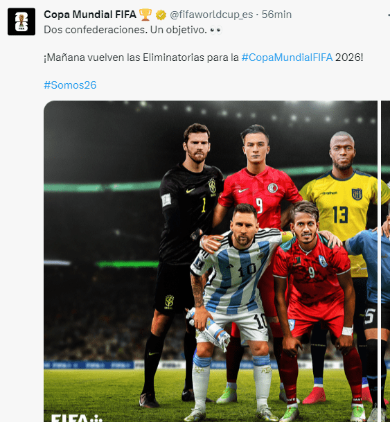 De igual forma, artes para representar los encuentros entre selecciones, como el de Darwin Núñez tomando mate frente a Luis Díaz tomando café. El jueves 12 arranca una nueva ilusión en Ecuador y se enfrentarán a Bolivia. La FIFA subió una imagen de un jugador por país representando a su nación y el delantero fue Enner Valencia.