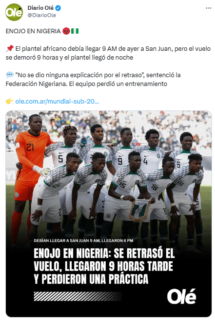 Ahora se acaba de destapar que Nigeria, su rival en octavos de final, sufrió un retraso de 9 nueve horas en su vuelo y por eso perdió la práctica que tenía programada para ayer. La Federación Nigeriana expresó su molestia y mencionó que nadie les dio una explicación sobre el retraso del vuelo.