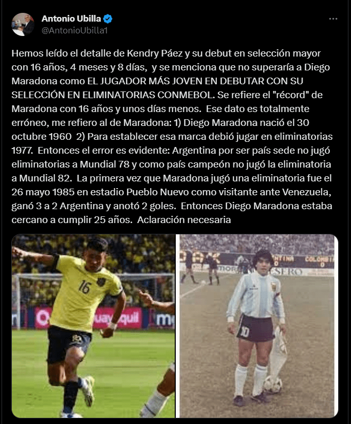 “El jugador más joven en debutar con su selección en Eliminatorias Conmebol se refiere al récord de Maradona con 16 años y unos días menos. Ese dato es totalmente erróneo. La primera vez que Maradona jugó una eliminatoria fue el 26 de mayo de 1985 en el Estadio Pueblo Nuevo como visitante ante Venezuela, ganó 3 a 2 Argentina y anotó 2 goles. Entonces Diego Maradona estaba cercano a cumplir 25 años. Aclaración necesaria”; informó vía twitter el comunicador Antonio Ubilla.