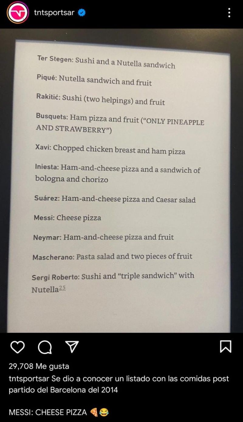 Fue un momento polémico que generó comentarios por parte de los hinchas que estaban a favor o en contra de sus palabras. Sin embargo, no es el único que también tiene peticiones poco saludables y se filtró que pasaba lo mismo en el FC Barcelona. En 2014, tras los partidos, Lionel Messi solicitaba de cena Pizza.