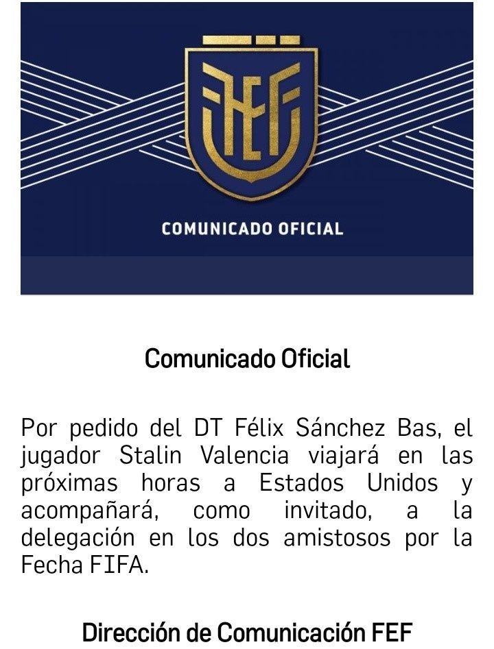 Sin embargo, la FEF dio a conocer a través de un comunicado oficial que Félix Sánchez llamó como invitado a los amistosos al defensa Stalin Valencia. Jugó con la selección Sub 20 en el Mundial de Argentina y por el número de centrales que ya tiene Ecuador sorprendió esta decisión.