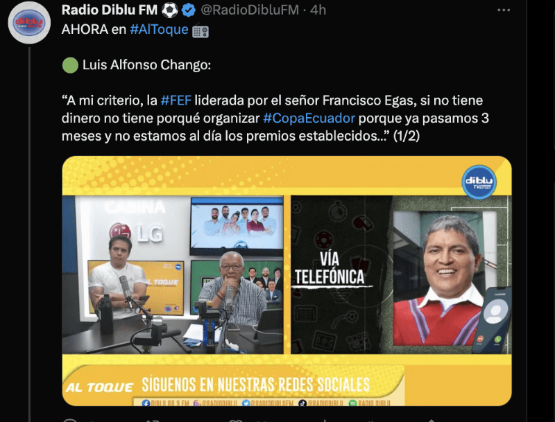 Chango estuvo en entrevista con Radio Diblu, y manifestó que si la FEF no tiene plata, no debe ponerse a organizar torneos: “A mi criterio, la FEF liderada por el señor Francisco Egas, si no tiene dinero no tiene por qué organizar Copa Ecuador porque ya pasamos 3 meses y no estamos al día los premios establecidos”