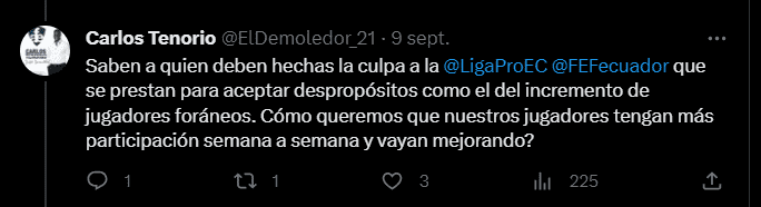 “¿Saben a quién deben echar la culpa? A la LigaPro y la FEF que se prestan para aceptar despropósitos como el del incremento de jugadores foráneos. ¿Cómo queremos que nuestros jugadores tengan más participación semana a semana y vayan mejorando”; comentó en primera instancia vía twitter el presidente de la Asociación de Futbolistas del Ecuador.