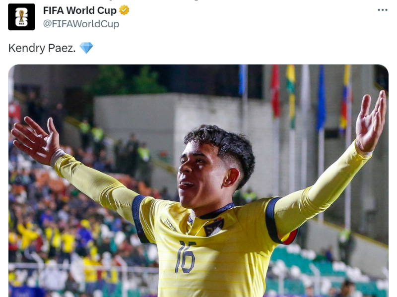 El jugador ha estado en un nivel muy alto y se ha mantenido entre los más importantes, incluso ya firmó con el Chelsea. Esto generó que los hinchas se mostrasen felices con el trabajo que realiza en ‘La Tri’. Tras marcar un gol importante frente a Bolivia, la cuenta oficial de X de la FIFA, decidió subir una publicación de Kendry Páez.